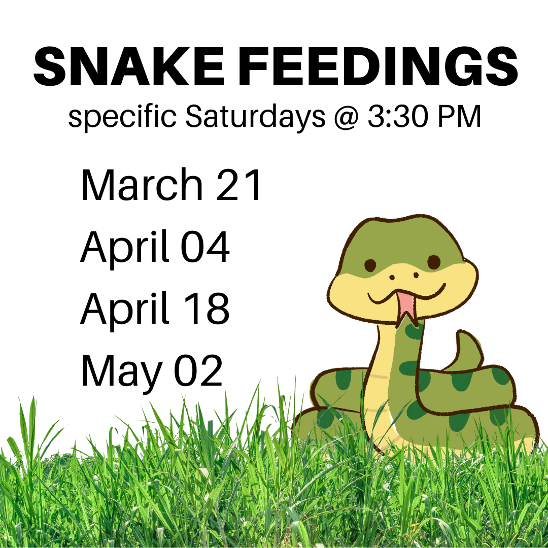It take a snake a long time to digest its dinner. That's why we feed them every 2 weeks. Visit HSC on a designated Saturday at 3:30 pm and you can watch them dine!